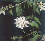 arbusto que como máximo alcanza 3-4 m de altura, con ramas angulosas, hojas caducas de color verde intenso, ovales, acuminadas, dentadas, glaucas por la cara superior, aterciopeladas por debajo de la nerviación, velludas en la porción axilar, con los bordes pilosos; flores grandes reunidas en racimos subterminales, blancas, bastante perfumadas y con la corola provista de cuatro pétalos |