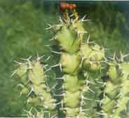 planta arbustiva que alcanza una longitud de 50-100 cm con ramas pentagonales, trigonales en la base, de color glauco y provistas de espinas robustas, con artículos breves y angulosos ribeteados por una lista córnea amarillenta y con dientes triangulares marcados; hojas pequeñas y caducas, flores amarillentas |