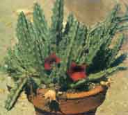 planta perenne con tallos carnosos de color verde grisáceo, erectos, con 4-5 ángulos salientes provistos de pequeños dientes agudos; las flores aparecen en la base de las ramas, provistas de una corola campaniforme con divisiones triangulares más o menos dobladas hacia nuera; la corola, de color rojo sangre, está provista de pelos rojos |