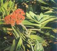 planta suculenta perenne, del tipo sufruticoso, con tallo erecto y provisto de hojas coriáceas de color verde intenso y ciliadas, de forma ovo-oblonga e invainan al tallo; flores reunidas en grandes cimas corimbosas de color rojo escarlata y bastante perfumadas por la tarde |