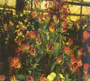 planta trepadora con raíces tuberosas; el tallo alcanza 2-3 m y está provisto de hojas lanceoladas de color verde brillante, con zarcillos terminales mediante los que se fija a los puntos de apoyo; flores solitarias con seis elementos petaloides, lanceolados, ondulados, recurvados hacia atrás, de color variable que van desde el rojo al amarillo anaranjado, extrañamente estriados o jaspeados; estambres largos con anteras gruesas |