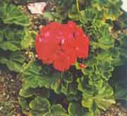 planta perenne algo sufruticosa, con el tallo de 1-2 m de altura como máximo, no muy ramificado; hojas no viscosas, toscas o glabrescentes, anchas, alternas, de formas redondeadas, con largo pecíolo, de borde , festoneado, manchadas la mayoría de las veces por una zona oscura en el centro de la lámina y con forma de herradura; flores simples o dobles, provistas de pétalos alargados, reunidas en umbelas, coloreadas de rojo, blanco, rosa, rojovioláceo, etc.; existen numerosas formas y variedades de «Pelargonium zonale» |