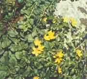 planta perenne, a veces rastrera y otras ramificada, provista de hojas opuestas, enteras, glabras, ovales y ligeramente pecioladas; flores amarillas en número de 1-2, situadas en la axila de las hojas, con corola pentámera bastante grande |