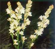 planta con raíces en forma de tubérculos, con tallo muy ramificado de un metro o metro y medio de altura; hojas lineares y canaliculadas sostenidas por el tallo que termina en una espiga de flores perfumadas blancas, difuminadas de rosa y con un largo tubo doblado |