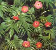 planta trepadora anual de 3-5 m de altura; hojas alternas y acorazonadas, enteras o angulosas en la base; flores de 3 cm de longitud, de borde pentagonal, color escarlata y reunidas en grupos de 3-6 en racimos unilaterales |