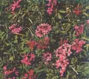 pequeño arbusto echado, de color rojizo oscuro, de 20-40 cm de longitud, desprovisto de hojas en su porción inferior, con abundantes hojas en la sumidad; hojas sésiles, oblongas, lineares, algo coriáceas, de color más claro en la parte inferior de las mismas y débilmente mucronadas; flores de cólor rojo vivo, poco pedunculadas y agrupadas en 8-10 para la formación de pequeñas umbelas situadas en la extremidad de las ramas |