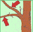 Brecha del follaje: cuando el follaje presenta "vacíos", por ejemplo después de una tormenta, se pueden colmar fijando hacia arriba ramas laterales que podrán así desarrollarse bien. Una vez la brecha invisible, rodriguen de nuevo estas ramas para mejorar su fructificación.