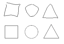 Enderezar y suavizarPuede enderezar o suavizar líneas y contornos de formas para remodelarlos.Ajuste el grado de suavizado o enderezamiento automático utilizando Configuración del dibujo en Preferencias. El enderezamiento hace los pequeños ajustes necesarios a las líneas y las curvas ya dibujadas. No tiene ningún efecto sobre los segmentos rectos. También puede utilizar la técnica de enderezamiento para que Flash reconozca las formas. Si dibuja cualquier forma ovalada, rectangular o triangular con la opción Reconocer formas desactivada, puede utilizar la opción Enderezar para hacer las formas geométricamente perfectas. Pero no reconoce las formas que se tocan y están conectadas con otros elementos. ![]() El reconocimiento de formas transforma las figuras superiores en las inferiores. El suavizado modera las curvas y reduce las protuberancias en la dirección general de la curva. También reduce el número de segmentos de la curva. Pero es relativo y no tiene ningún efecto sobre segmentos rectos. Es especialmente útil cuando surgen dificultades al remodelar una serie de segmentos curvos muy cortos. Al seleccionar los segmentos y suavizarlos se reduce su número y el resultado es una curva más suave y fácil de remodelar. La aplicación reiterada del suavizado o enderezamiento hace que el segmento se suavice o enderece, según lo recto o curvo que estuviera originalmente.