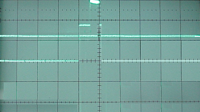El nivel de cero del osciloscopio se ajusto a mitad de pantalla. La sensibilidad vertical del osciloscopio fue ajustada a 3 V/div y la horizontal a 10uS/div. La línea blanca continua que se observa superpuesta a nivel de 3,5 V es el pulso de borrado vertical.