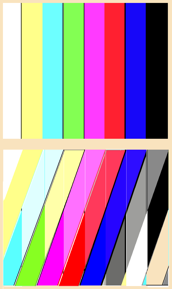 ¿Como se ajusta la frecuencia del oscilador de color en un TV?Primero digamos cual es la falla que se produce cuando dicha frecuencia está desajustada. La imagen de un TV color debe considerarse como el dibujo de una historieta en colores. Se hace un dibujo en blanco y negro con los bordes bien netos (que son los que le dan definición a la imagen) y luego se colorea con los bordes de color dibujados en forma burda. Es decir que hay en realidad dos imágenes superpuestas, una en ByN y otra en color. Si el oscilador de subportadora no esta bien enganchado con el burst la imagen de color se inclina y aparece en diferente posición que la de blanco y negro. En la figura 2 se puede observar como se vería un cuadro de barra de colores en este caso. Se observa una imagen en blanco y negro con una escala de grises perfectamente enganchada y sobre ella una imagen de barra de colores con los colores cambiando en rotación sobre la imagen de blanco y negro.