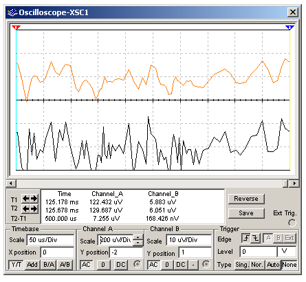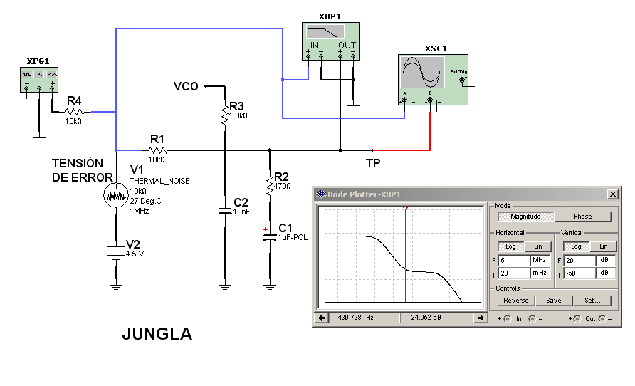 La parte externa del jungla es muy simple. Solo consta de 4 componentes. En su interior observamos un generador de ruido que representa a la señal de error del CAFase color, en serie con una tensión continua que es la polarización central del VCO alrededor de la cual se produce la tensión de error. Por el funcionamiento normal del CAFase la señal de error tiene forma de ruido rosa con frecuencia máxima del orden de los 10 KHz. Esta señal de error debe ser fitrada con un filtro compuesto antes de aplicarla al VCO (Voltaje Controled Oscilator que es el oscilador a cristal). En el mismo circuito se puede observar la curva de respuesta del filtro. Esta curva de respuesta deja pasar las señales continuas sin atenuar y posee un primer corte de respuesta en unos 10 Hz producido por R1, R2 y C1 y un segundo corte producido por R1, R2 y C2 a unos 40 KHz. En el circuito también conectamos un osciloscopio para observar el efecto del filtro sobre la señal de control del VCO.