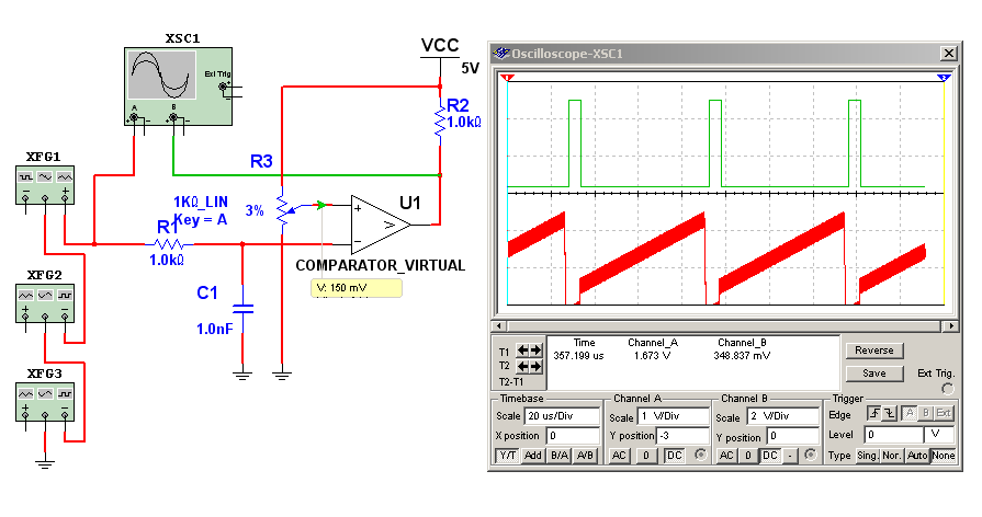 Para simplificar el problema nosotros solo vamos a analizar el pulso horizontal pero dejamos aclarado que también funciona con la señal de video completa con ambos pulsos de sincronismo. El circuito puede funcionar con señales de video de 1V pero lo hace mejor si funciona a una tensión mayor. Por eso en general se amplifica el video primero a nivel de 5V y luego se lo recorta. Nosotros simplemente vamos a aumentar los niveles de los generadores.