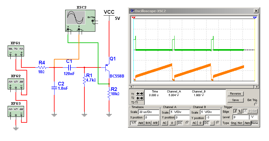 El generador XFG3 genera una señal de 3,58 MHz con la fase correspondiente al rojo; el generador XFG2 genera el pulso de sincronismo horizontal y el XFG1 genera la rampa de luminancia. En la parte inferior del osciloscopio se puede observar la señal generada a ritmo horizontal y en la parte superior la señal recortada de salida en donde no se observan vestigios de video o de color. El color se elimina con el filtro R1C1 y el preset ajusta al nivel de recorte deseado, en este caso 150 mV. Este recortador de sincronismo parece perfecto y de hecho lo sería si no fuera porque un TV debe funcionar en cualquier condición de señal de entrada. Si el TV tiene baja señal es posible que en cierto momento el mínimo de la misma no llegue a 150 mV y entonces se cortan los pulsos de salida y el TV se queda sin sincronismo horizontal. Se podría detectar el valor pico a pico de la señal de video y con ese valor hacer un recortador de nivel variable. Pero no es necesario porque un simple circuito a transistor soluciona el problema y es prácticamente la solución adoptada por todos los fabricantes de la época del 90.