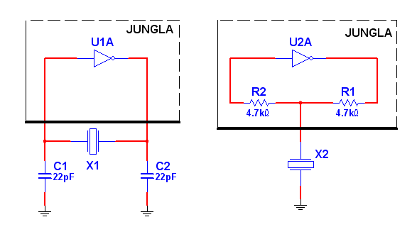 25 Osciladores horizontalesEn el momento actual los junglas utilizan los osciladores a cristal de la sección de color como osciladores horizontales y no poseen ya el oscilador a filtro cerámico de 32FH. De algún modo generan la frecuencia horizontal a partir de la frecuencia de la subportadora de color y luego, también por división, la frecuencia vertical, pero no podemos dejar de estudiar los osciladores horizontal más comunes que son los de filtro cerámico de 32 FH ya que si hiciéramos un análisis cuantitativo tal vez la mitad de los TV que ingresan a un taller de América Latina probablemente son de este tipo. Repasando hasta ahora sabemos que en los TV más comunes la señal de video compuesta mas la subportadora de sonido sale de jungla ingresa en el sistema de FI de sonido, luego se filtra con una trampa de 4,5 MHz e ingresa a un seguidor por emisor para reducir la impedancia. De ese emisor se toman tres caminos de regreso al jungla, uno va directamente o a través de una línea de retardo de luminancia y filtro de 3,58MHz y es la entrada de video (Luma = Y) y el otro suele ingresar a través de una red LC o con filtro cerámico y es la entrada de la subportadora de color. La tercera es la separadora de sincronismos que ingresa como una señal de video deformada y dentro del jungla se transforma en la señal de sincronismo horizontal H y la de sincronismo vertical V. La señal H llega a la zona del CAFase H junto con la señal del oscilador horizontal que precisamente estamos estudiando. Estos osciladores pueden ser de diferente tipo pero siempre se trata de un VCO (Voltaje Controled Oscilator = oscilador controlado por tensión). No importa como oscila, el tendrá una pata de control de frecuencia que funciona por tensión. La señal H y una señal derivada del oscilador ingresan a un CAFase que genera la tensión continua de error que controla al VCO. A continuación vamos a estudiar en detalle los VCO a filtro cerámico e inversores; los osciladores tipo 555 y posterioremente un CAFase real entre el oscilador y el pulso de sincronismo. Osciladores de 32 FH con filtro cerámico e inversoresUn oscilador horizontal actual tiene que funcionar en dos frecuencias por lo menos cuando no en tres. Por lo menos debe funcionar en los sistemas PAL y NTSC (15.625 y 15.750Hz respectivamente) debido a la imposibilidad práctica de construir filtros cerámicos de frecuencias tan bajas ya sabemos que en realidad funcionaran en un armónico superior. Por lo tanto del filtro cerámico no puede ser elegida al azar, sino en valores armónicos de la frecuencia horizontal para que el contador cuente por un número entero. De estudios económicos y de factibilidad se dedujo que las frecuencias más convenientes están en el orden de los 500kHz y que los contadores deben contar por un valor 2 elevado a la “n” en donde “n” debe ser un valor entero y pequeño. Esto significa que el valor de conteo debe ser 2, 4, 8, 16, 32, 64, etc, debido a la facilidad para construir circuitos que cuenten por estas cantidades. Tomando el factor 32 podemos calcular que la frecuencia del filtro cerámico será de 32 x 15.625Hz = 500kHz para PAL y 504kHz para NTSC que es la frecuencia postulada como ideal en lo económico y confiable. ¿Necesitamos entonces un conmutador de filtros para un TV binorma? No, en la práctica debido a que el rango de reenganche del CAFase es suficientemente amplio, sólo se utiliza uno que por lo general es el de 500kHz (mejor sería de 502KHz). En la figura 24.2.1 se puede observar los osciladores mas comunes a inversor de dos patas y de 1 pata. ¿Cuáles son los contadores utilizados universalmente? Son del tipo de registro de desplazamiento (shift register) que no son más que una cadena de flip-flop RS en donde un primer divisor divide por dos, el siguiente vuelve a dividir por dos la salida del anterior y así sucesivamente; es decir que con 5 etapas se consigue la división por 32 que estamos buscando. El diagrama en bloques completo de la sección osciladora se puede observar en la figura 2. En él vemos que el circuito tiene dos salidas; una corresponde a la salida horizontal de 15.625Hz o 15.750Hz y una salida anterior en donde se obtiene 31.250 o 31.500Hz que están destinadas al generador vertical por conteo y al generador horizontal de los TV que pueden trabajar con barrido progresivo.
