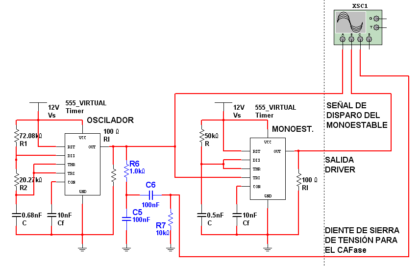 A los efectos del análisis del CAFase, podemos suponer que con la señal rectangular de salida del oscilador debidamente amplificada se genera de algún modo una señal con forma de diente de sierra de corriente circulando por el yugo. Más adelante veremos que en realidad el pulso de sincronismo horizontal debiera compararse directamente con la rampa de corriente que circula por el yugo, pero no es simple obtener una muestra de la corriente que circula por el, debido a los elevados valores que se manejan (3 A aproximadamente). Es más simple generar una señal equivalente a la que circula por el yugo por integración de una señal derivada del oscilador. Si ampliamos el sector de retrazado horizontal podremos observar que se trata de una recta con una pendiente elevada y con un valor nulo en su parte central. Para realizar la primer experiencia con un CAFase diseñamos un astable con un 555 y un monoestable con el mismo integrado de forma de obtener un diente de sierra de tensión equivalente al diente de sierra de corriente por el yugo horizontal y además generamos la forma de señal de salida adecuada para atacar a la etapa driver.