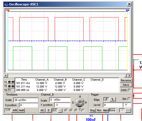 En el circuito pusimos un osciloscopio de 4 canales para poder realizar comparación de oscilogramas con mas facilidad. El oscilograma que tomamos como referencia es la señal del oscilador podemos observar en la figura siguiente.