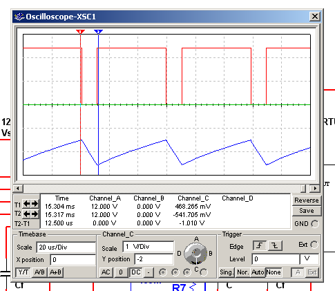 En rojo, la salida del oscilador tiene un tiempo de actividad muy corto del orden del 18% del total es decir 12 uS de duración que es lo que dura el retrazado horizontal. Esos pulsos se utilizan para dos funciones: A) generar el diente de sierra de tensión similar al de corriente y B) excitar al monoestable que será quien en definitiva genere la forma de onda de color verde que presenta un 65% de tiempo de actividad adecuado para excitar al driver horizontal. En la figura siguiente se puede observar la otra salida del circuito que es el diente de sierra equivalente de tensión.