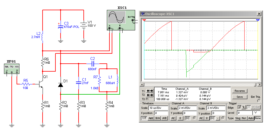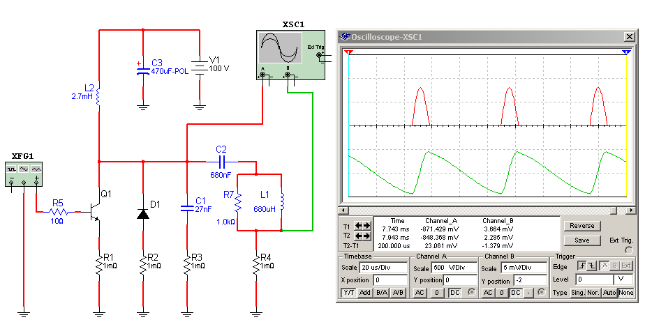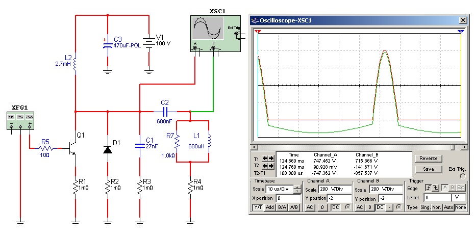 A continuación vamos a comprobar que sean ciertas algunas consideraciones que acabamos de realizar. Como por ejemplo que C2 es prácticamente una batería. Para ello basta con conectar los dos canales del osciloscopio sobre el colector de Q1 y sobre el yugo. Podemos observar que durante el trazado prácticamente se cumple lo indicado; la diferencia entre las dos señales es de 100V en promedio aunque vemos que al principio y al final del trazado es de 50V y en el medio del trazado de 200. Si se aumenta el valor de C2 a por ejemplo 10 uF se consigue mantener el valor fijo en 100 V pero entonces se observa una falla en la pantalla, sobre todo si se usa una señal de prueba con forma de retícula.
