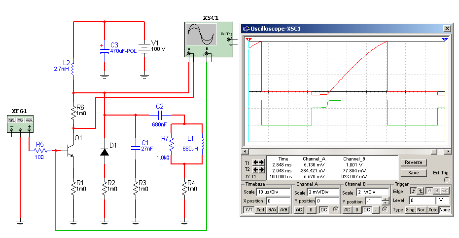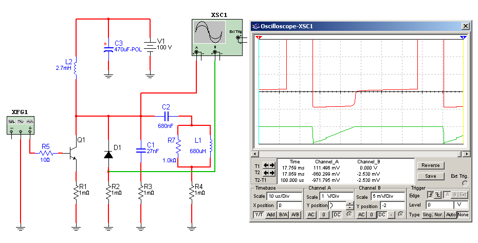 Con el agregado de un capacitor ya se puede construir una etapa que podría llegar a funcionar realmente aunque aun usa una llave controlada por tensión y no un transistor como llave. Este circuito corrige dos problemas al mismo tiempo. Observe que solo agregamos el capacitor C1 de 16 nF con un valor tal que se genere un valor de tensión de pico compatible con un transistor de salida horizontal de 1500V. En efecto obtenemos un valor clásico de 800V. Lo primero que notamos es que el tiempo de retrazado (que es la demora que sufre el haz para volver al borde izquierdo de la pantalla luego de llegar hasta el derecho) es mucho más grande que antes. El tiempo de retrazado no tiene porque ser mayor que el tiempo de borrado horizontal previsto por la norma. Y la norma indica que el tiempo de borrado es del 18% y nuestro tiempo de retrazado es también de ese valor con lo cual todo está en forma. Pero lo más importante de este circuito es su aspecto didáctico. En el se pueden entender los ciclos de trabajo con toda facilidad.